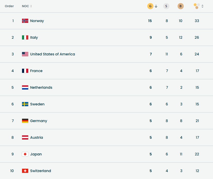 Сборная Норвегии довела медальный актив до 33 наград (15 золотых, 8 серебряных и 10 бронзовых). Такой запас прочности делает её безусловным фаворитом общего зачёта. На второй позиции закрепилась Италия – 26 медалей (9-5-12), а третьими идут США с 24 наградами (7-11-6), традиционно берущие своё в технических дисциплинах и экстремальных видах.