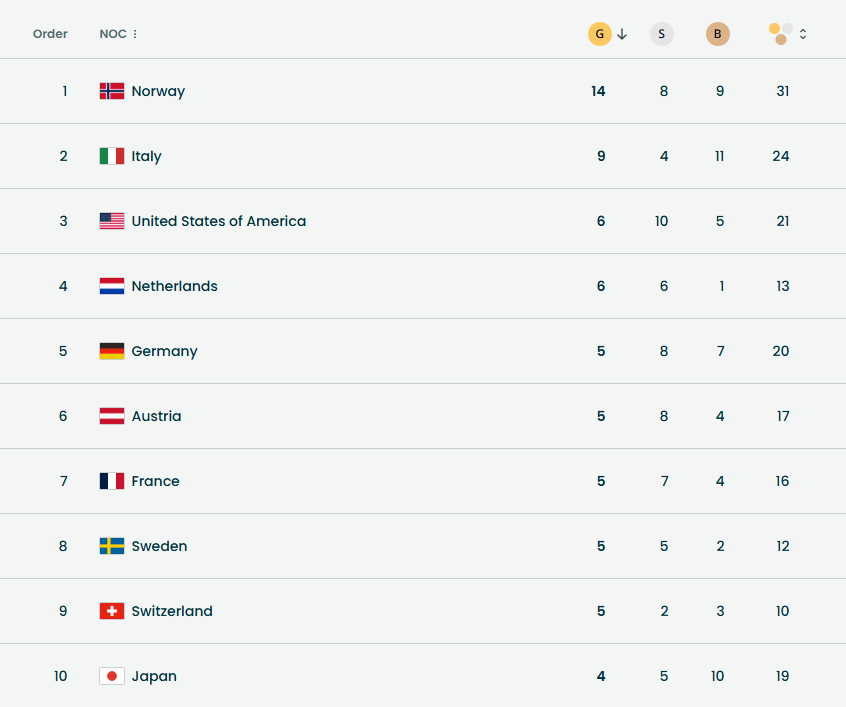 После 17 февраля Норвегия продолжает доминировать в медальном зачёте: 31 награда (14-8-9) и практически гарантированное первое место. Италия, выступающая дома, уверенно идёт второй – 24 медали (9-4-11). Тройку замыкают США – 21 (6-10-5). В пятёрке также Нидерланды (13 медалей) и Германия (20), резко поднявшаяся благодаря успехам в бобслее и коньках.