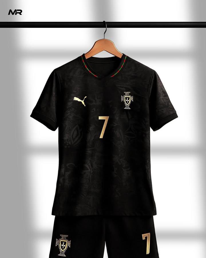 Первый – «blackout» с элементами роскоши: чёрный матовый цвет, а на ткани виден сложный глянцевый узор, напоминающий традиционные португальские орнаменты. Все логотипы и номера выполнены в золотистом цвете, что создаёт премиальный контраст. Форма выглядит минималистично и очень современно. Комплект сочетает в себе спортивную эстетику и высокую моду.